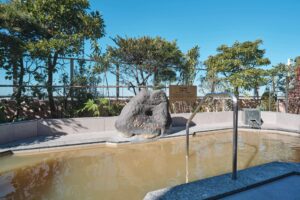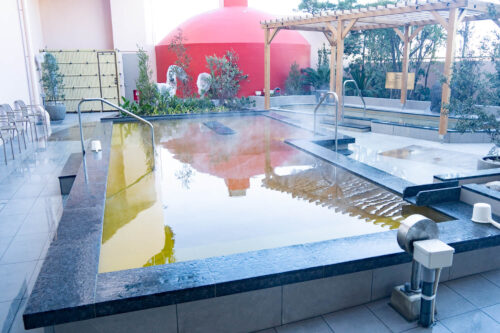 露天風呂は温泉濃度50%、同じく屋外の黄金の湯は源泉かけ流しです。露天エリアにはベンチを増やし、休憩しやすくなりました。