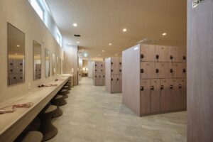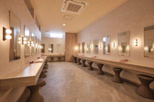女湯は、パーク閉園後の時間など一度に多くの客が入っても対応できるよう、洗い場を大幅に増設。