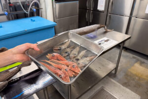 美味しくてもサイズが規格外であったり、見た目が悪い、知名度が低いなどの理由により、市場で利用されない「未利用魚」に焦点を当て、未利用魚が普通に販売されている世界を表現した展示です。