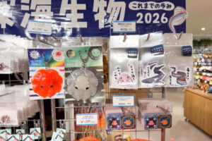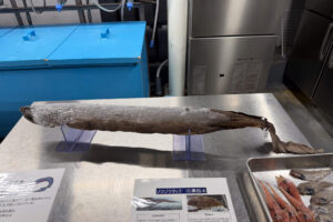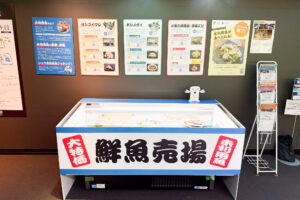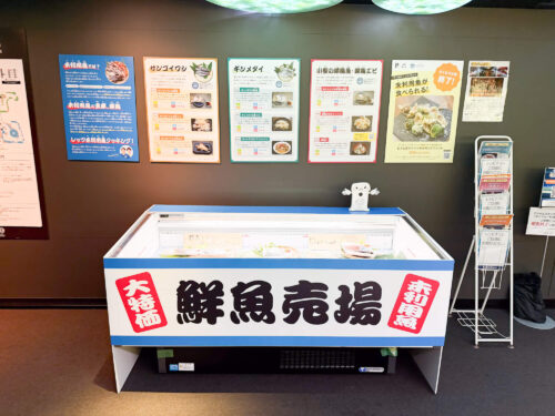 水槽や標本が並ぶ展示の中に、突如スーパーの鮮魚コーナーが登場。