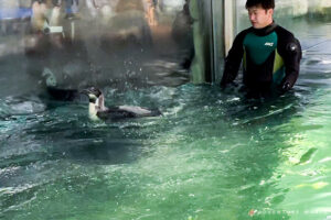 今後、他のペンギンたちと同じ運動場内で過ごすことを見据え、プールの中でも安全に過ごせるよう、飼育スタッフがそばにつきながら練習を行っていきます。
