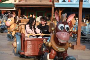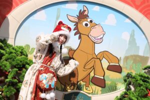 午年の初日を記念して行われたこの由緒ある儀式には、「トイ・ストーリー」シリーズの馬キャラクター、ブルズアイが、お祝いの衣装をまとったミッキーとミニーと登場。