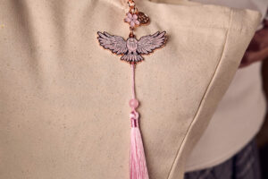桜をまとったフクロウモチーフのキーリング。