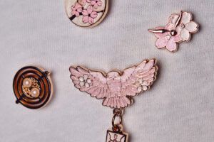 桜モチーフが散りばめられたピンバッジのセット。