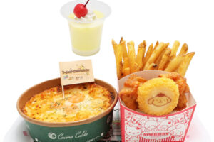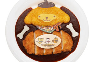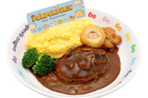 中でも注目は、チキンブイヨンと魚介の旨みがつまったパエリアライスの「ポムポムプリンとチームプリンのアニバーサリー欧風カツカレー」。ドッグボーン型のかまぼこやアニバーサリー仕様の盛り付けが特別感を演出します。