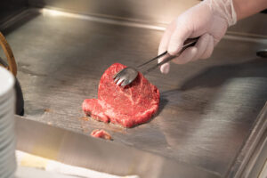 ライブキッチンには国産牛肉の鉄板焼きが登場。目の前の鉄板で焼いてもらえます。