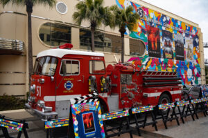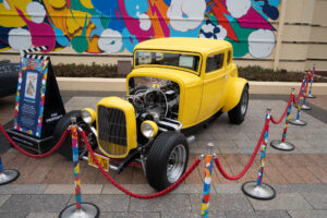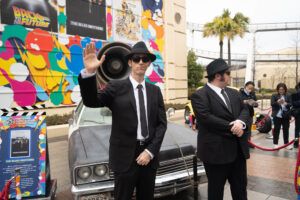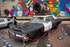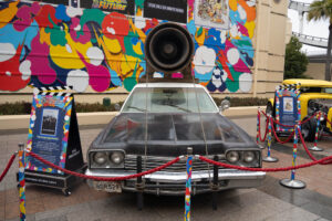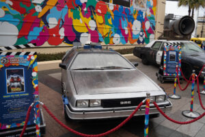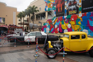 「バック・トゥ・ザ・フューチャー」のタイムマシン、「バックドラフト」の消防車、「ブルース・ブラザーズ」のパトカー、「アメリカン・グラフィティ」の1932年型クラシックカーがずらりと並んでいます。