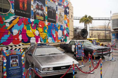 ハリウッド・エリア 年間パス・センター前には、名作映画に登場した名車が並び、背後には大型ポスターも掲示。