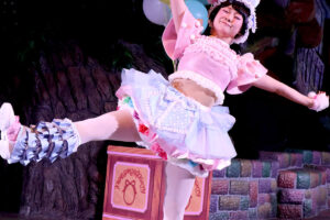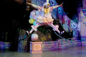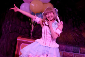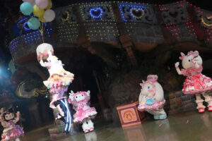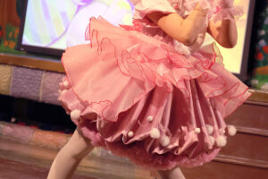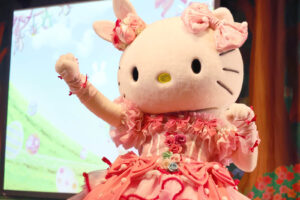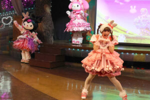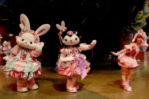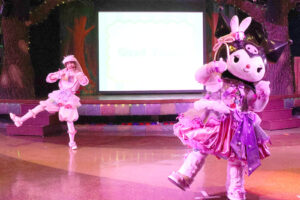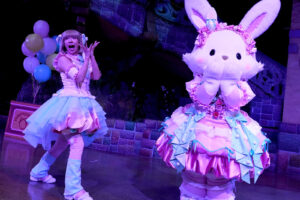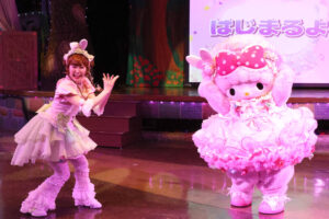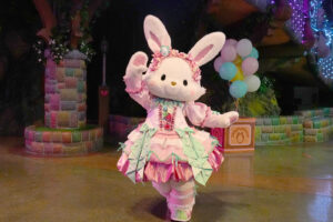 キャラクターは春らしいパステルカラーのうさぎ風コスチュームで登場。コスチュームのスカートはお花畑をイメージして作られており、ジャンプをするとふわっとお花が咲いたように見える点もポイントです。