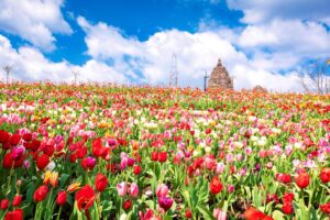 アンコール王朝の栄華を物語る復元寺院「プラサット・ヒン・アルン」や、アラビアンな雰囲気の美しい寺院「モスク」、幸せの国ブータン王国の僧院「タシチョ・ゾン」など、チューリップとビオラが彩るガーデンとアジアの遺跡が織りなす景観は、NEWレオマワールドならではの魅力です。