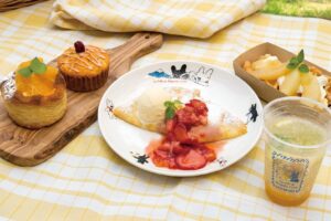 リサとガスパール タウン内にある各飲食店舗では期間限定のオリジナルフェアメニューを販売します。ショップでは「お花」関連グッズを販売。