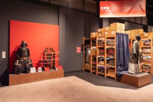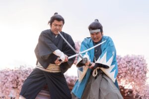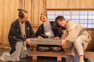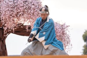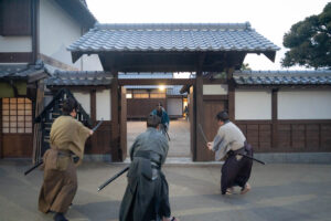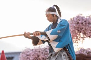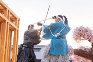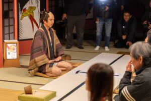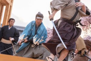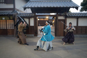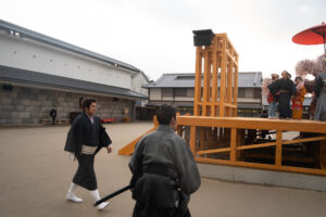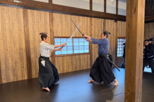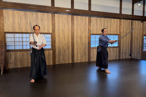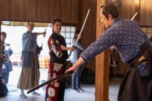 入門⽣として実際に刀を手に取り、刀の構えや所作、侍の心得を学びます。師匠による殺陣のデモンストレーションも見られます。