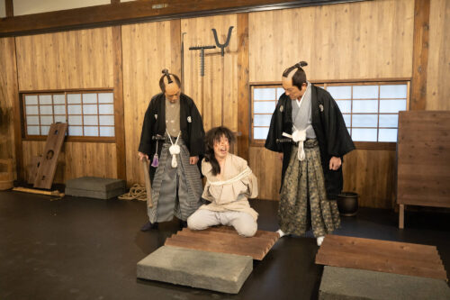 江戸時代の拷問による取り調べを見られる拷問屋敷。撮影所の美術スタッフが再現した拷問器具の数々を使い、デモンストレーションを披露します。
