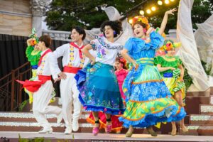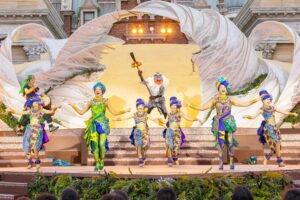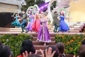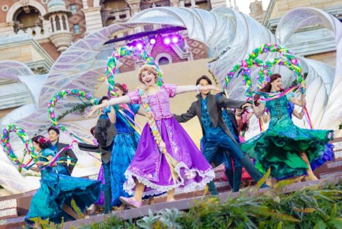 さらにラプンツェルが登場。「キングダムダンス」でフォークダンスを踊り、お花が散りばめられた華やかなで優雅なステージを披露します。