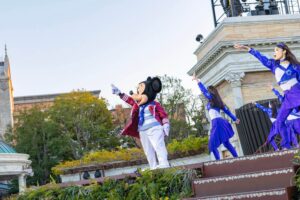 ミッキーは「世界のダンスと音楽の祭典」のショーの幕開けを宣言します。