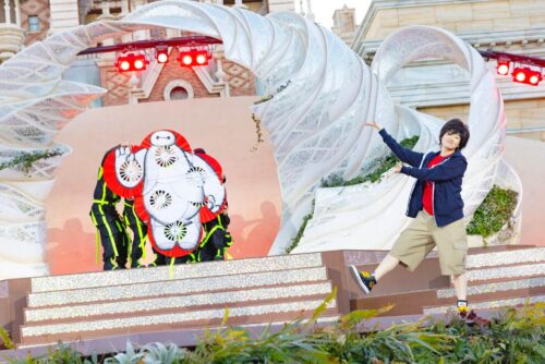 和傘を用いたパフォーマンスや、大漁旗のような大きな旗が舞い、ベイマックスのデザインです。