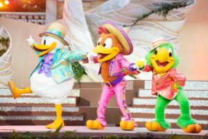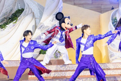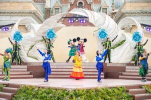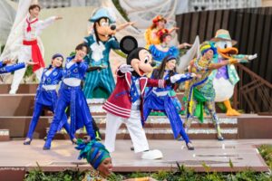 ミッキーとミニーが、これまでのステージを盛り上げたダンサーと一緒に登場。「みんなで世界のダンスを踊ろう!」と、ゲストと一緒に参加ダンスを行います。