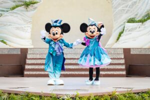 ミッキーたちが25周年の衣装でステージに登場します。