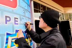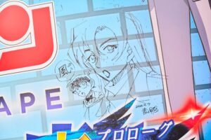 本日の来場を記念して「名探偵コナン・ザ・エスケープ」アトラクション外壁に千速とコナン、「名探偵コナン・ミステリー・レストラン」に隣接するロンバーズ・ランディング前テラスに世良とコナンのイラストを描きました。