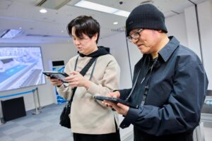 リアル脱出ゲーム「名探偵コナン・ザ・エスケープ」を体験した青山先生。自らの頭上に100基以上のドローンが飛行する状況で参加者とともに人質になり、タブレットを手に施設内を巡りました。