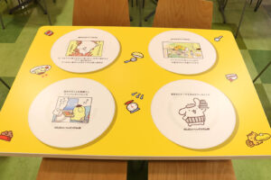 チキンブイヨンと魚介の旨みがつまったパエリアライスに、ドッグボーン型のかまぼこやアニバーサリー仕様の盛り付けが特別感を演出する「ポムポムプリンとチームプリンのアニバーサリー欧風カツカレー」など、定番のカレーメニューも「POMPOMPURIN 30th Anniversary」仕様で登場。