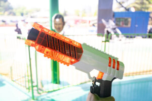 園内各所にある的を赤外線銃で撃ち、当たると自身のスマートフォンで音が鳴り点数が追加されていくアトラクションです。