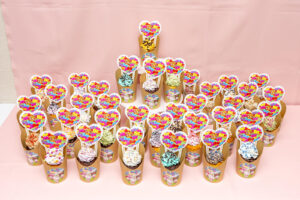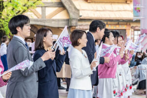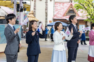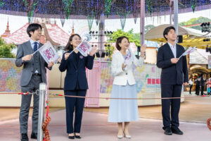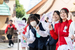 雨の中、開園前から非常に多くのゲストが並び、10時に開園すると、ハーモニービレッジでは小巻社長を中心にたくさんのスタッフがお出迎え。35周年セレモニーは、10:30から雨のためハーモニービレッジに会場を変更して開催されました。