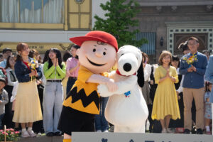 関西ヘルスケアパビリオン横「リボーンステージ」に、パークのキャラクターが登場。