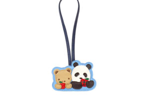 パンダとクマちゃんが仲良く大好きなリンゴを食べているかわいらしいアートです。マットな質感で落ちつきのある上品な仕上がりです。チャームとしても、ポシェットとセットでもおすすめのアイテムです。