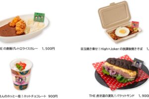 軽食・売店ミルクホールではミニキャラが印字されたピックが添えられた「FRAMEの唐揚げレトロライスカレー」や「目玉焼き乗せ!High×Jokerの放課後焼きそば」のほか、舶来グリルや青果八百八などでもコラボメニューを提供します。