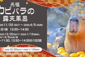 伊豆シャボテン動物公園は、元祖カピバラの露天風呂を、2025年11月22日(土)〜2026年4月5日(日)の期間、開催します。