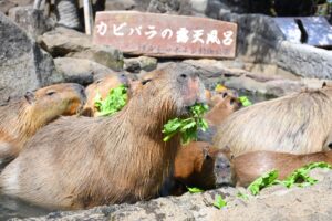 初日の11月22日(土)は、「お風呂開き!カピバラの草カット」と題して、10:30から番頭に扮した飼育スタッフが挨拶を実施。続いてカピバラたちがテープカットならぬ青草をカットして今シーズンの「元祖カピバラの露天風呂」がスタートします。