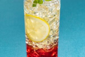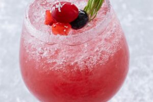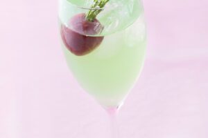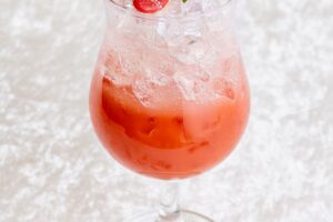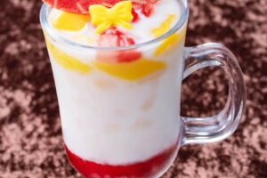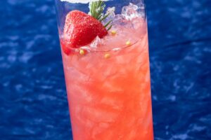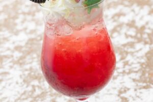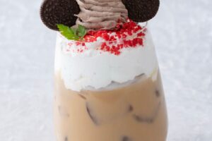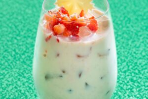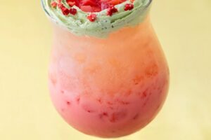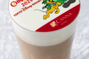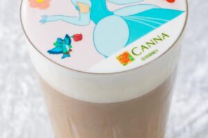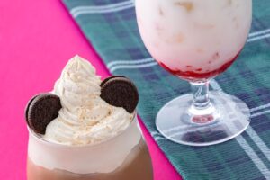 イチゴミルクのようなやさしい味わいのスペシャルドリンク(1,100円)は、帽子型のラングドシャーやマンゴープリンをのせ、エネルギッシュで明るいジェシーを表現しています。