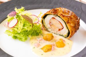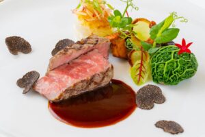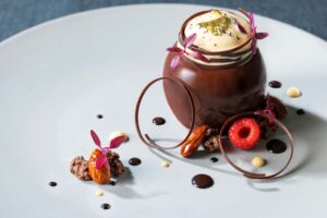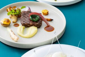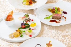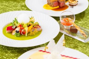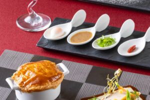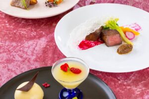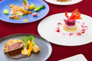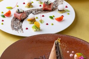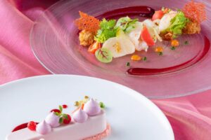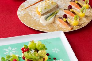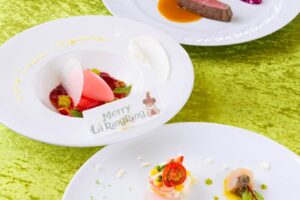 フランスで親しまれている「牛肉のタルタル」をアレンジした前菜や、ランス菓子の「オペラ」と彩り豊かなルビーチョコレートのブリュレでクリスマスツリーを表現したデザートなどが並びます。