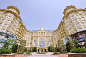 東京ディズニーシー・ファンタジースプリングスホテルでは、メインエントランス周辺には、シャンパンゴールドのイルミネーションが輝き、2026年1月31日(日)まで点灯が続きます。
