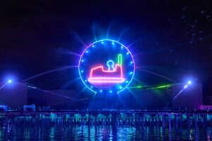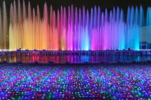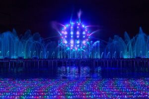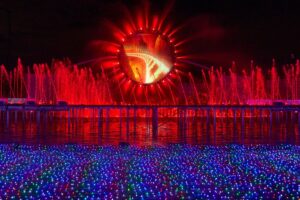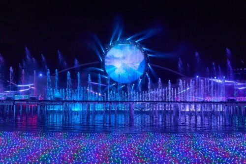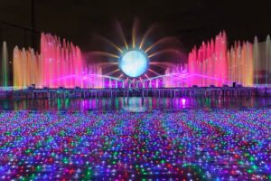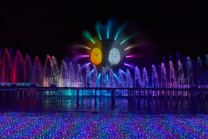 高さ15mの巨大リングのウォータースクリーン映像や272本の噴水、レーザーと炎による演出でショーを繰り広げます。