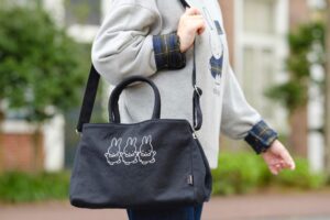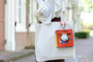 ドムトールンからミッフィーがのぞくコラボロゴをあしらった、お出かけにぴったりのトートバッグ(4,290円)やキーホルダー(1,100円)などの限定グッズが登場。