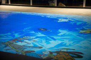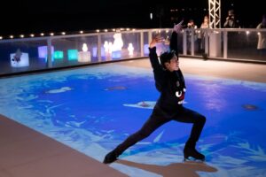 夜のスケートリンクは、プロジェクションマッピングにより昼とは違った姿を見せます。滑る人に合わせてムーミン谷の仲間たちや光の演出が変化し、インタラクティブなナイトスケートができます。