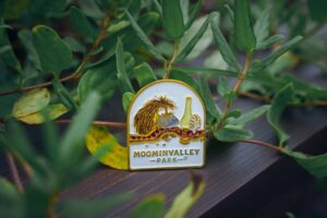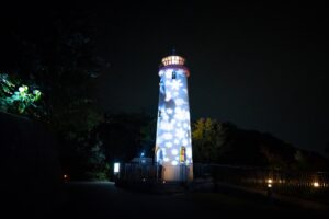 夜になるとムーミン屋敷には冬の景色が映し出され、上空にはオーロラが現れます。屋敷の両側に立つメタセコイヤにはLEDライトが設置され、ムーミンたちキャラクターのシルエットや色とりどりの光の演出がエリアを鮮やかに彩ります。
