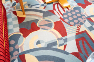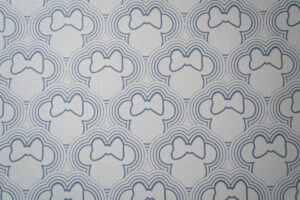 カーペットやベッドスローは、ミニーの水玉模様やリボンをモチーフにしたデザイン。初期の水色スカートをイメージしたカラーリングです。
