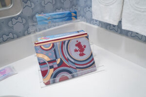 宿泊すると、オリジナルポーチをプレゼント。客室のカーペットのデザインがポーチになっていつでも持ち歩けます。