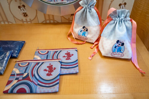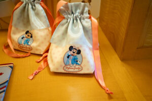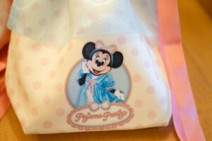 さらに、「パジャマパーティー」プランではきんちゃくも、1室につき2個をプレゼントします。パジャマを着たミニーの写真を使用した、持ち手付きのきんちゃくです。