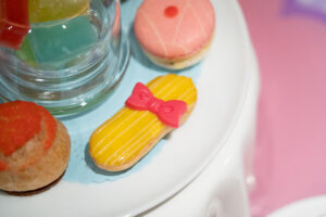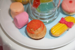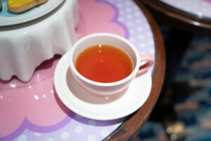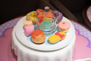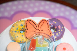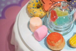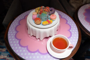 ラウンジでは、スウィーツプレートとノンカフェインの紅茶を用意。ミニーのリボンをイメージした焼き菓子や、ドーナツ、マカロンなど、パステルカラーのかわいらしいスウィーツが可愛いサイズで並んでいます。