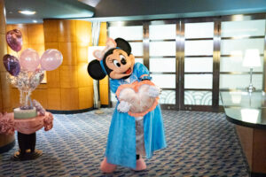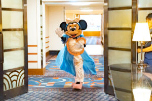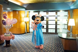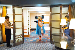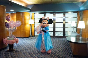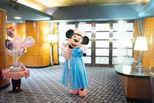 そしてラウンジにミニーが登場。水色のパジャマとピンクのリボンを付けた、ここでしか会えない衣装のミニーがやってきます。