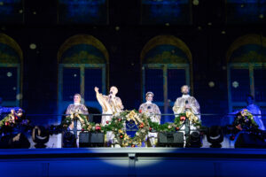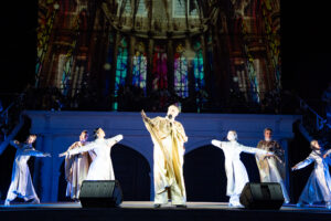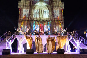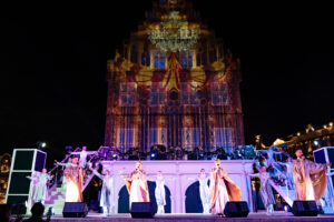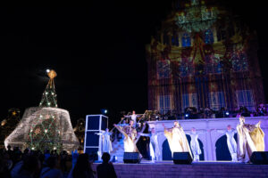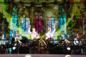 海外シンガー4人による生歌でクリスマスソングを歌唱。迫力の歌声と共にチームエキサイトによるダンスが繰り広げられ、光や映像、スモークや雪の演出も。