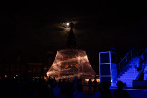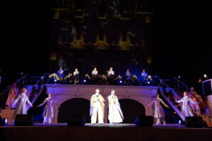 「もみの木」の楽曲で、ステージの明かりがツリーへ移るかのようにグランド・シャンデリアツリーが煌めきだし、ツリーが華やかに点灯します。