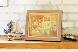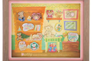 そして、部屋に飾ればいつでもパークでの思い出を重ねることができる、過去の代表的なアートをモチーフにしたピンバッジセット(25,000円)も登場します。台紙にはダッフィーの部屋をイメージしたアートが描かれています。