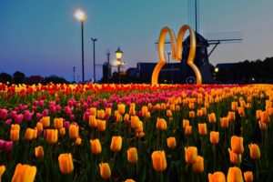 フラワーロードでは、一面のチューリップ畑に、ピンクの自転車や白いブランコなどフォトジェニックなロケーションも設置。夜にはライトアップされた「ナイトチューリップ」を行います。