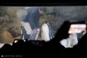 飼育スタッフによる、これまでの成長を振り返るトークイベントでは、当日のエンペラーペンギンの赤ちゃんの体重は14.8kgと、誕生時の295.9gから約50倍の重さにまで成長したことを報告し、赤ちゃんの成長の喜びをゲストと分かち合いました。
