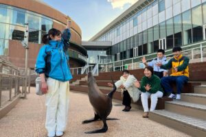 生きものたちとの近さを体感できる屋外エリア「オーシャンテラス」で開催している「アシカのおさんぽタイム」では、エリック・カールの代表作品のひとつである「できるかな?あたまからつまさきまで」のストーリーになぞらえて、カリフォルニアアシカがさまざまなパフォーマンスにチャレンジします。